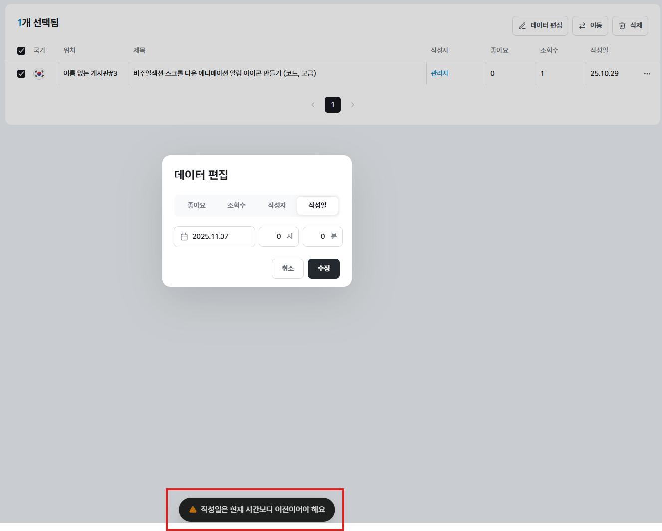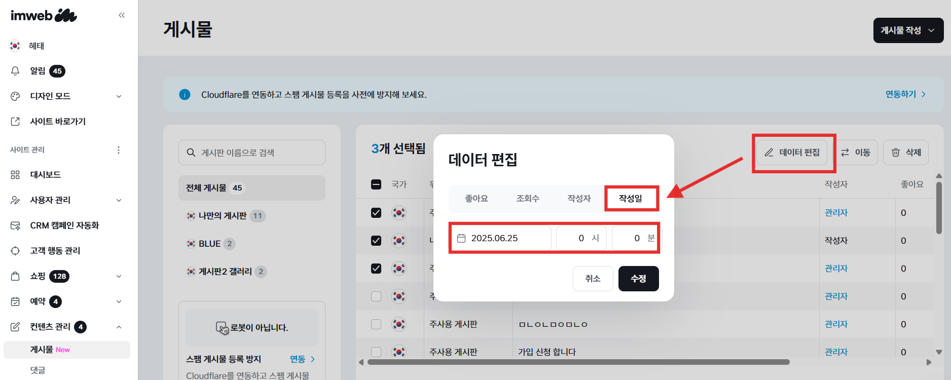 미리보기를 통해 변경한 시간대로 게시글이 정렬되고 있는지 확인해 주세요.