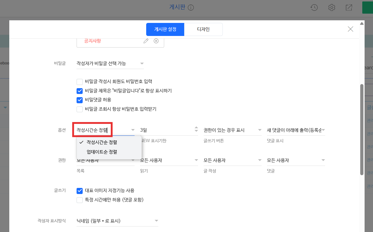 4. 마지막으로 디자인 모드의 게시판 위젯이 있는 메뉴로 접속하여 [게시판 위젯 우 클릭 - 게시판 설정] 에서 옵션을 ‘작성시간순 정렬'로 설정해 주세요.