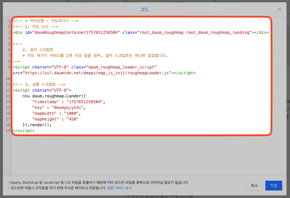 하지만 이 때, 코드 위젯을 활용하면 이런 과정 없이도 카카오맵을 바로 추가할 수 있습니다.