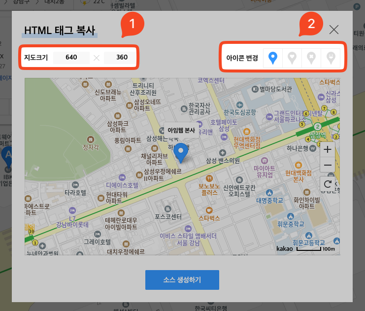 5. 마지막으로 소스 생성하기 클릭해 퍼가기 태그를 복사합니다.