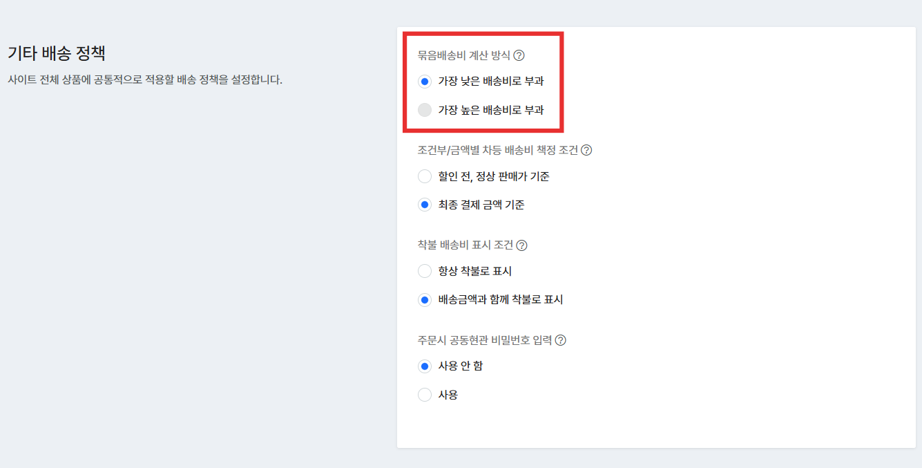 현재에는 '가장 낮은 배송비로 부과' 옵션만 사용 가능하며 높은 배송비 부과 옵션은 현재 사용 불가한 점 참고해 주세요.