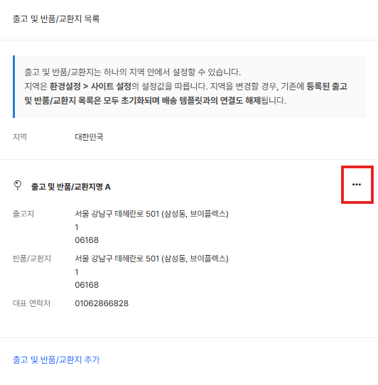 상품 출고지 주소와 반품/교환지 주소를 추가합니다. 출고지와 반품/교환지 주소가 동일하다면 같은 주소를 설정하고, 필요에 따라 다르게 설정하거나 새롭게 추가할 수도 있습니다.