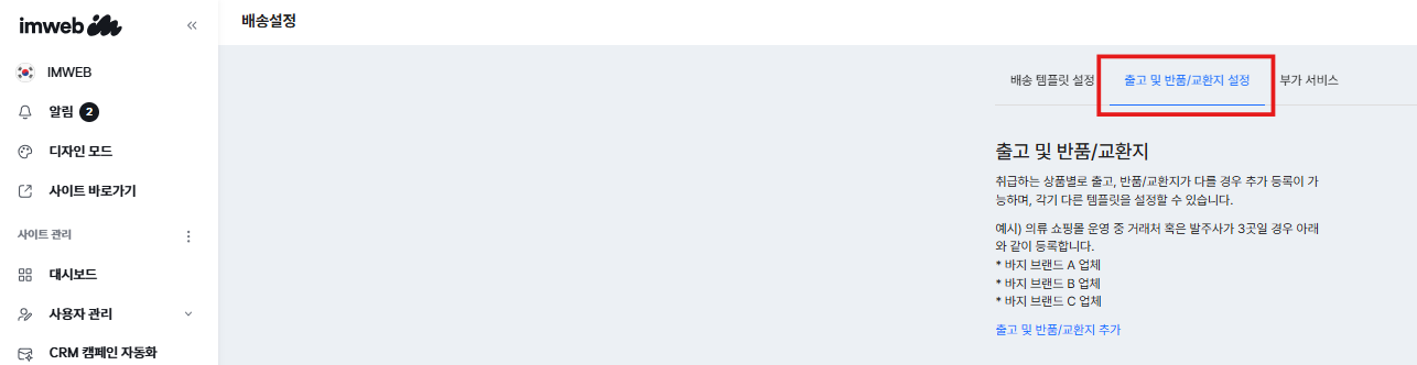 배송설정에서 상단의 출고 및 반품/교환지 설정 탭을 클릭합니다.