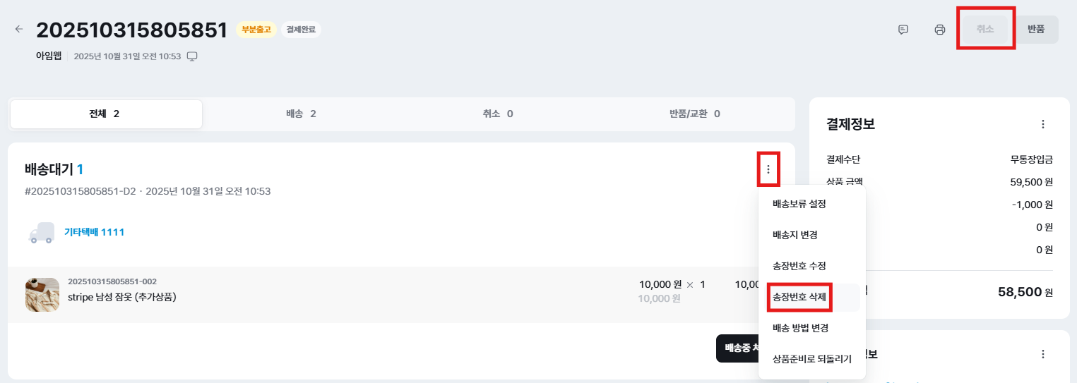 다만, 배송대기 상태더라도 송장번호가 입력되어있으면 취소가 불가합니다. 이때에는 아래와 같이 송장 번호를 삭제 후 접수해 보세요.