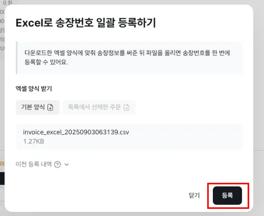 기본 양식 혹은 일괄 등록이 필요한 주문을 선택한 양식을 다운로드합니다.