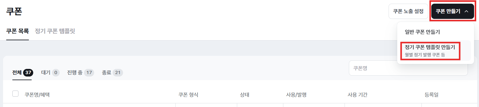 1. [쇼핑 > 쿠폰] 메뉴에서 ‘쿠폰 만들기’ → ‘정기 쿠폰 템플릿 만들기’를 선택해 주세요.