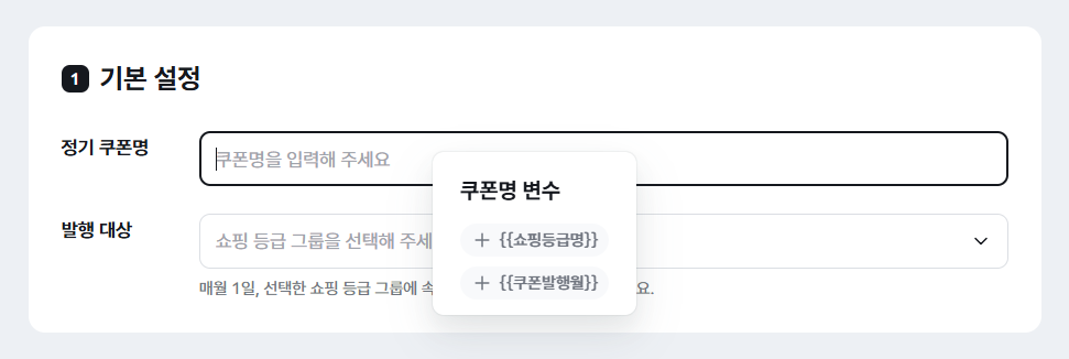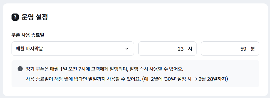 ⓘ 예시 사용 기한을 ‘매월 마지막 날’로 설정하면, 12/1 발행 쿠폰은 12/1~12/31까지 사용 가능해요.