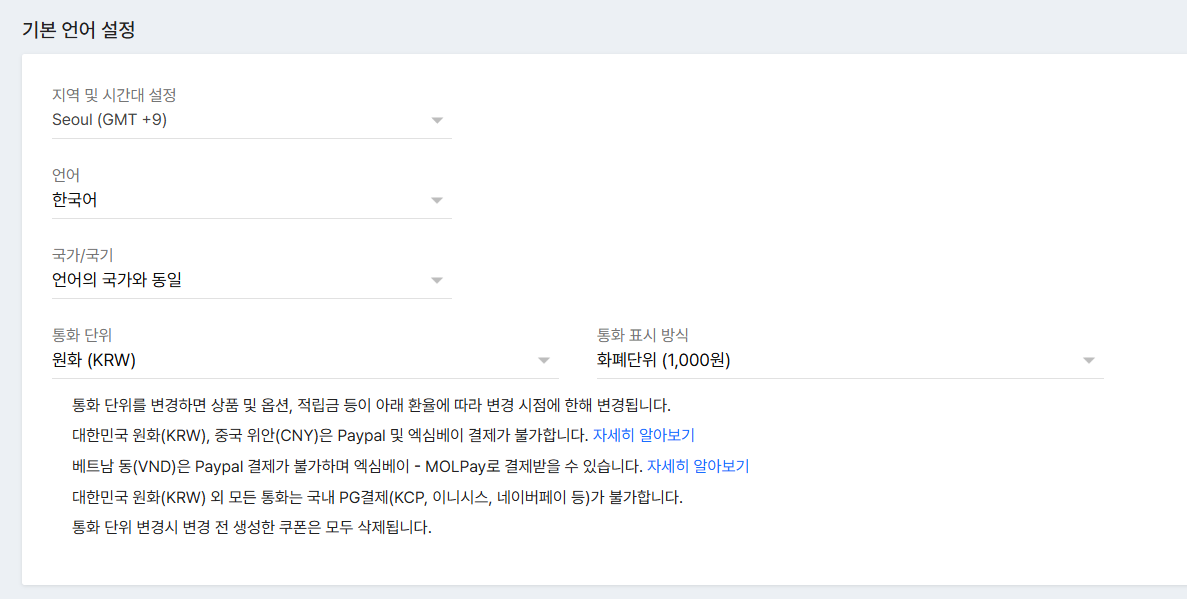 - 언어·지역·통화: 사이트의 대표 언어 및 통화, 시간대 등을 설정합니다.