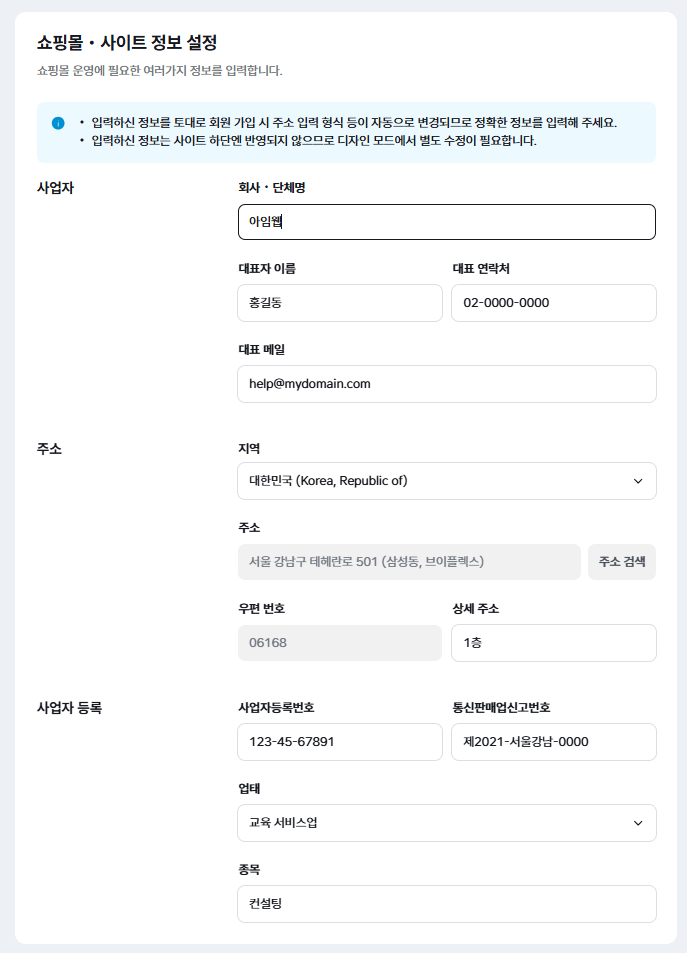 상점/사이트 정보 설정에 사용자의 사업자 정보를 입력할 수 있습니다. 이곳에 입력한 정보는 회원가입 시 주소 입력 형식에 영향을 주며, 사이트(쇼핑몰) 작동에 필요한 여러 정보를 자동으로 반영합니다.