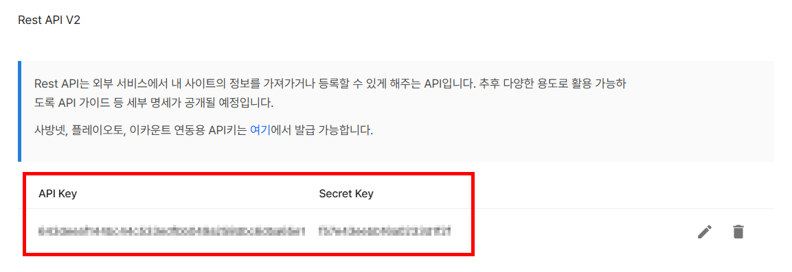 API Key와 Secret Key가 발급됩니다. 발급받은 값들은 다음 3단계에서 사용됩니다.