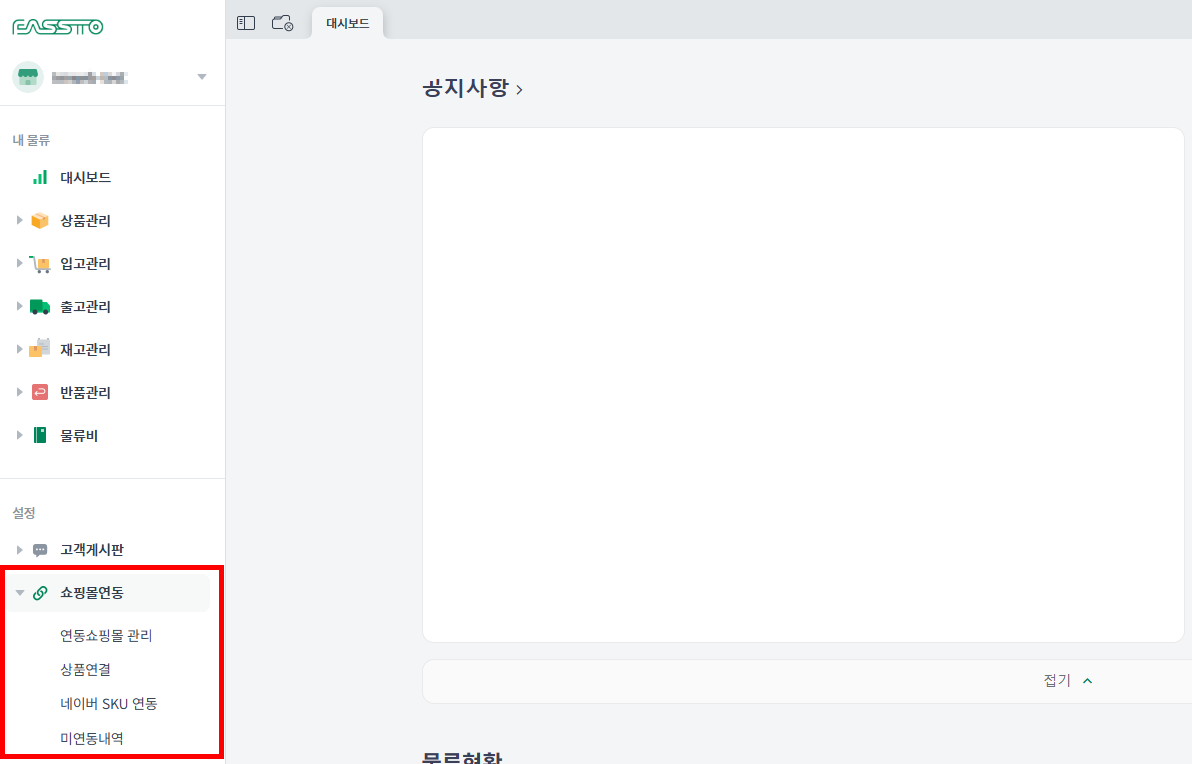 왼쪽 메뉴에서 [쇼핑몰 연동 > 연동 쇼핑몰 관리 메뉴]로 이동합니다.