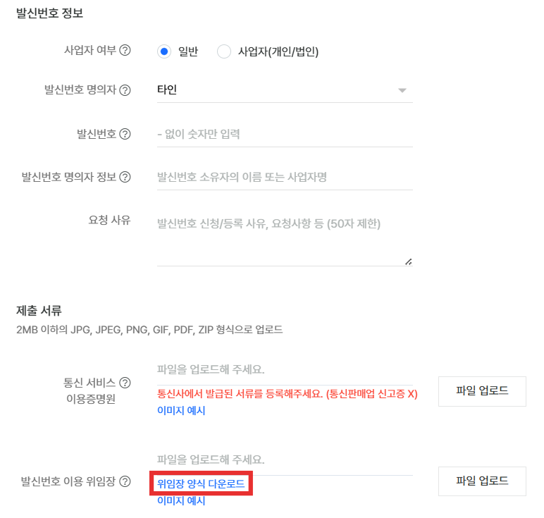 - [관리자 페이지 > 사용자 관리 > SMS·알림톡 > 발신번호 등록/변경] 버튼 클릭 후 명의자를 소유자가 아닌 '타인' 등으로 설정하신 후 제출 서류 항목에서 '위임장 양식 다운로드' 버튼을 클릭해 주세요