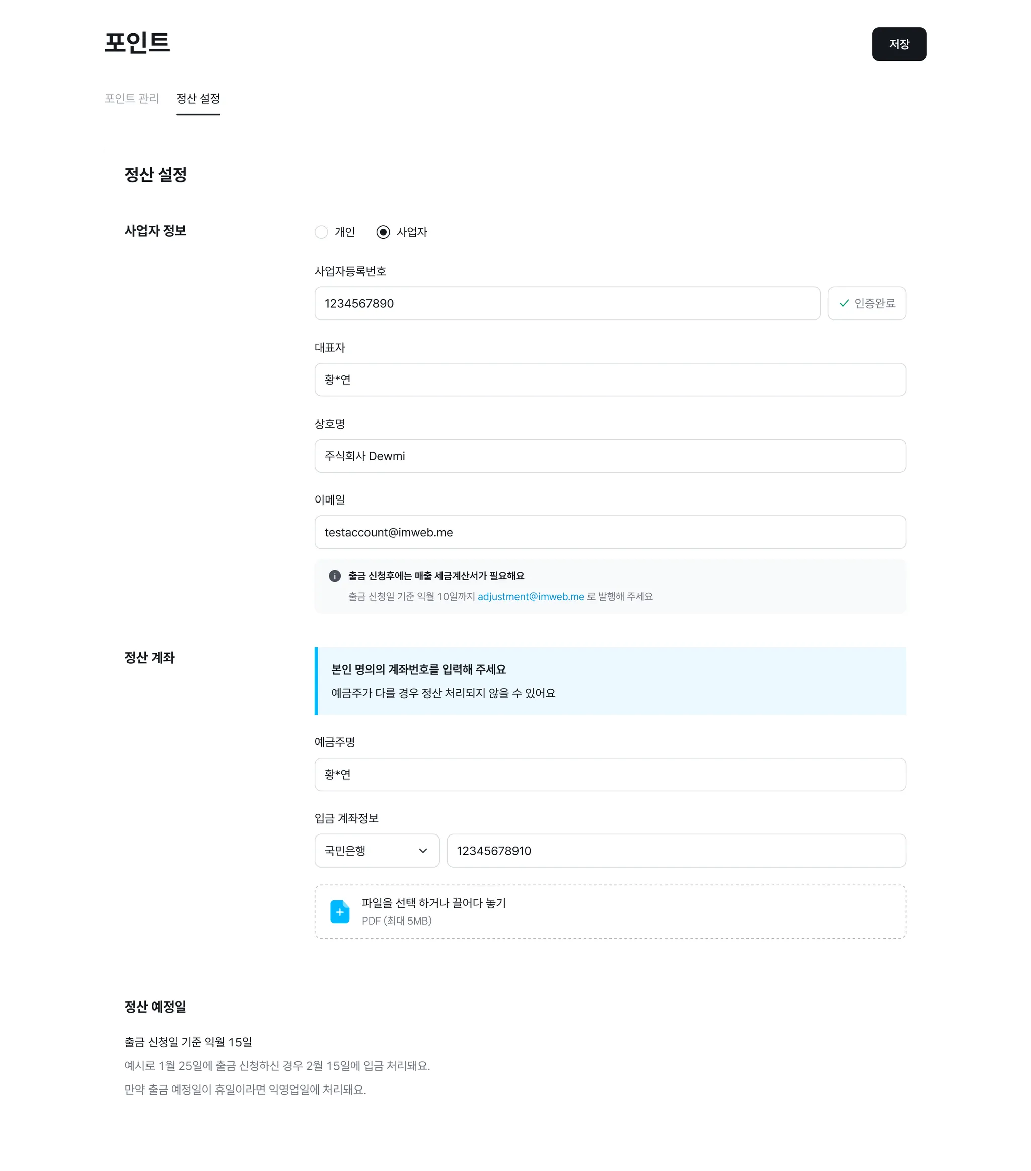 - 정산 계좌 항목에 예금주명과 입금 계좌정보(은행명, 계좌번호)를 입력합니다.