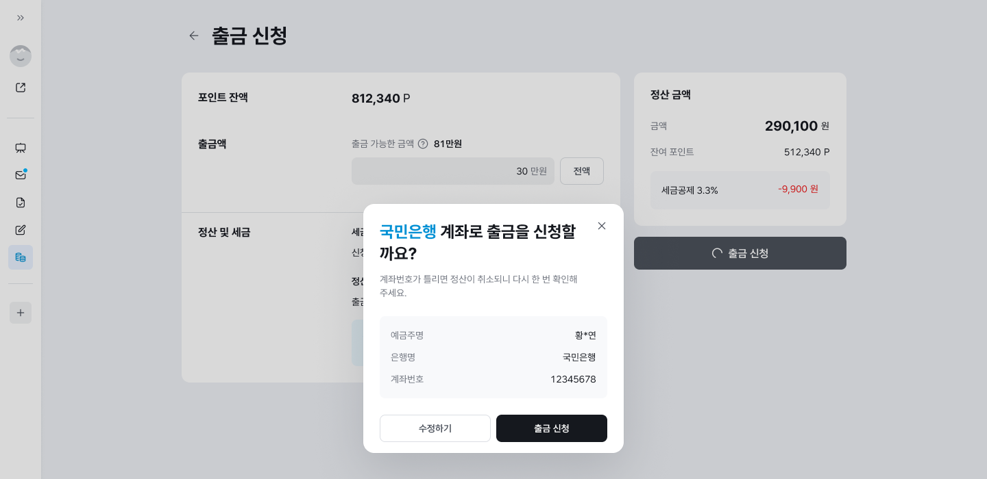 주의: 출금 신청 후 은행 정보를 반드시 제대로 확인해 주세요. 계좌번호가 정확하지 않을 경우 정산 신청이 취소돼요.