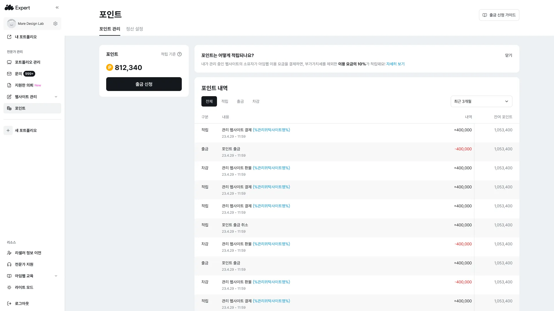 전문가 관리자 페이지 > 포인트 메뉴