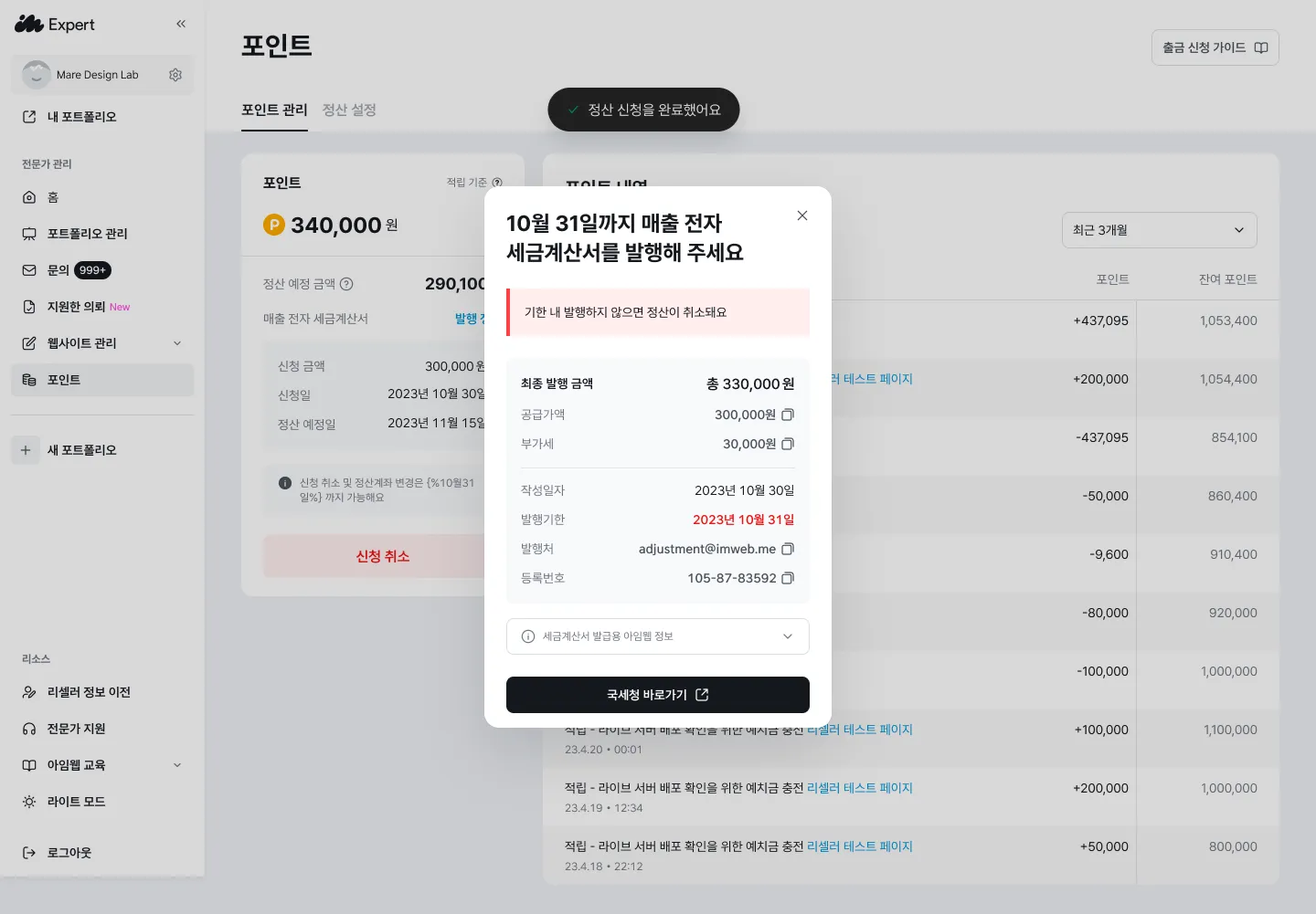 사업자(개인/법인)일 경우엔 반드시 당월 말일까지 홈택스에서 전자세금계산서를 아임웹 앞으로 발행해야 해요. 미발행 시 정산이 반려됩니다.