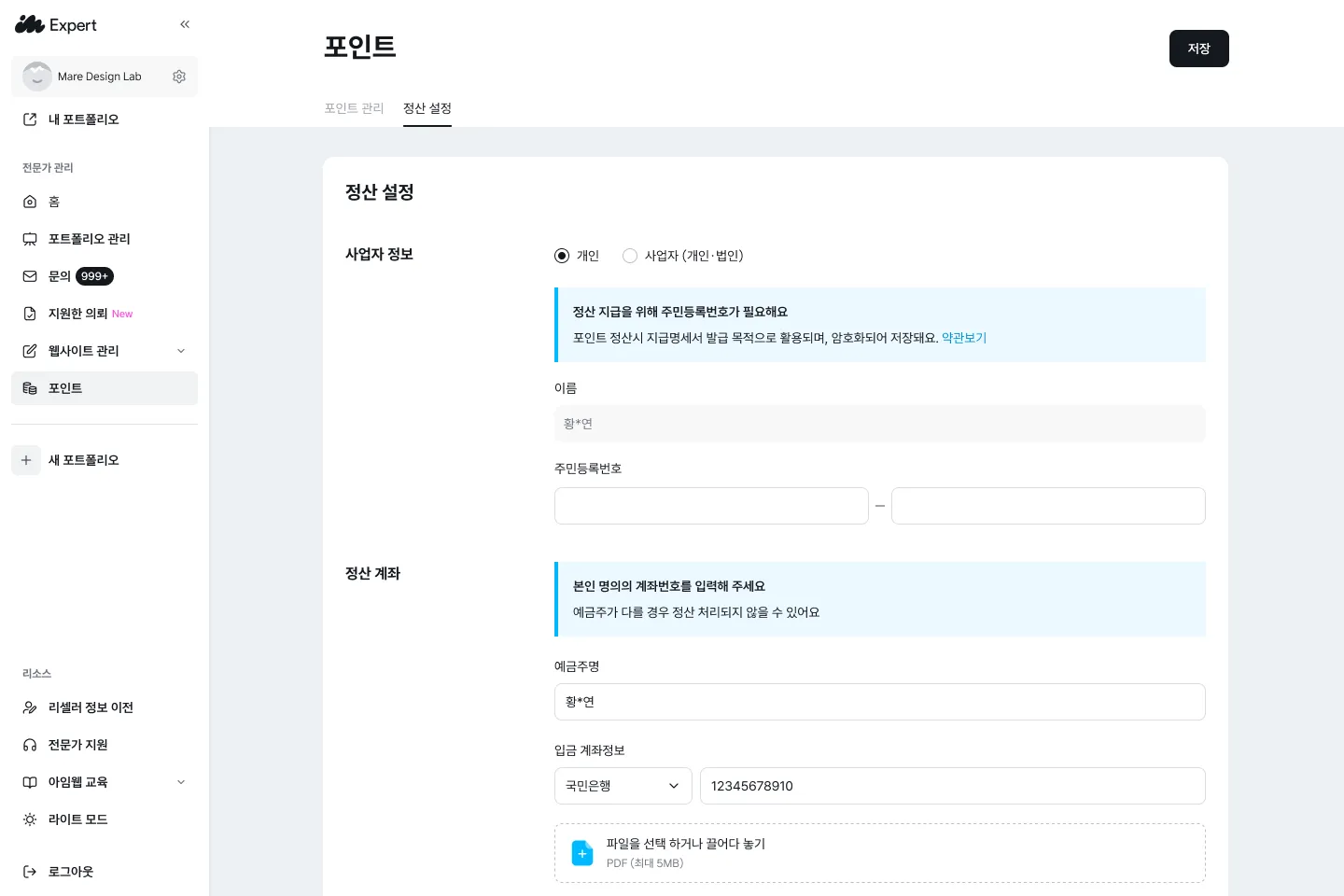- [전문가 관리자 페이지 > 포인트 > 정산 설정] 에서 정산 정보를 입력합니다.
