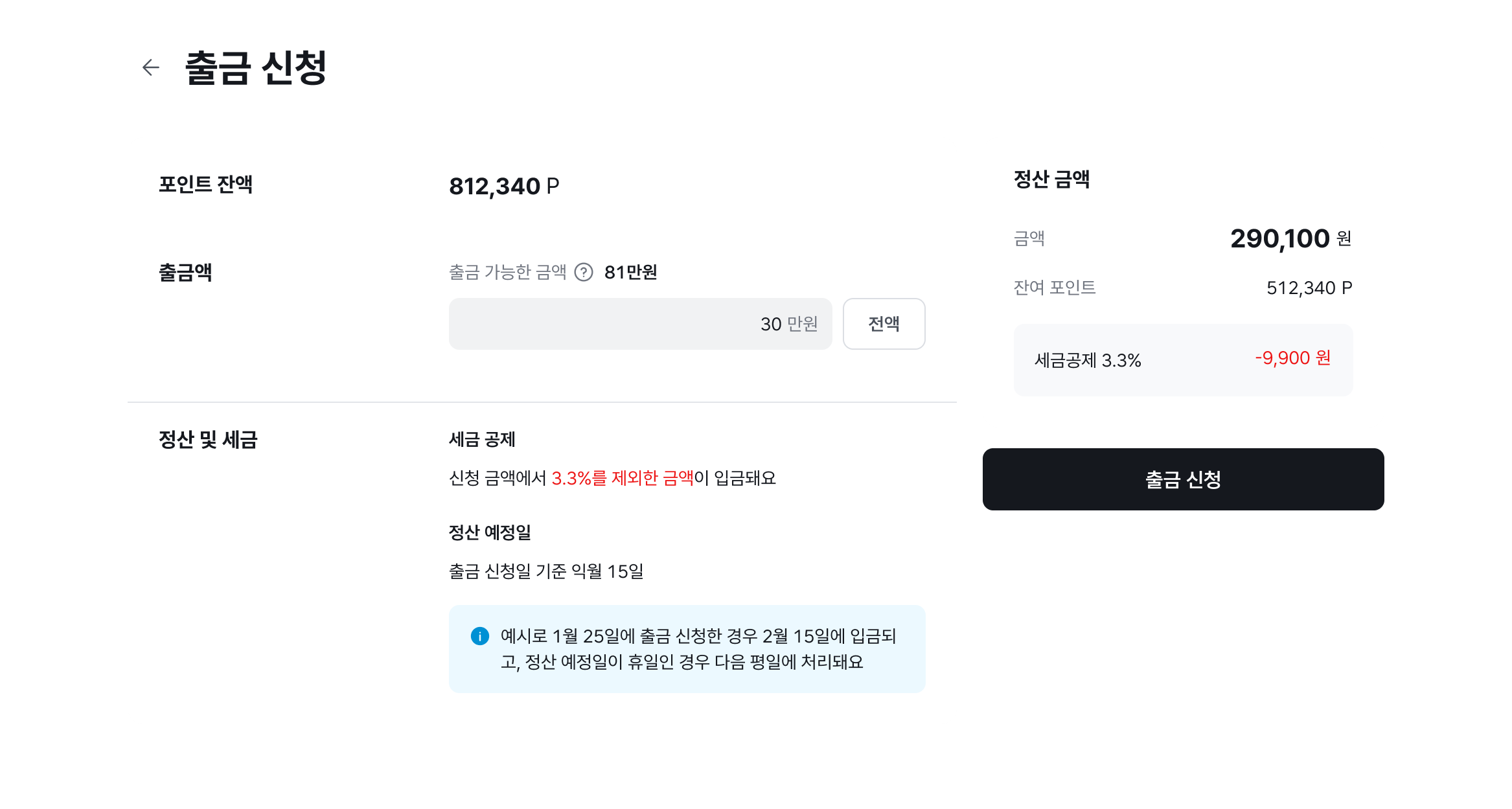 정산 정보를 모두 입력한 후에 출금 신청을 할 수 있어요.