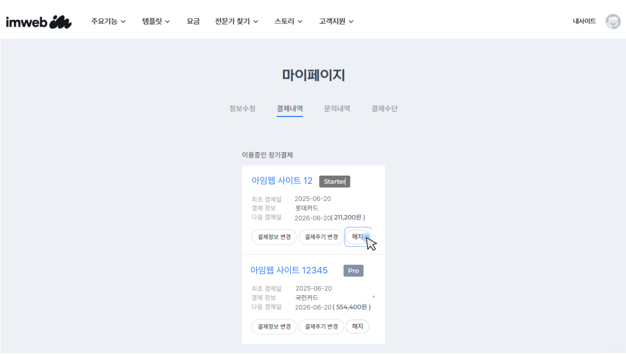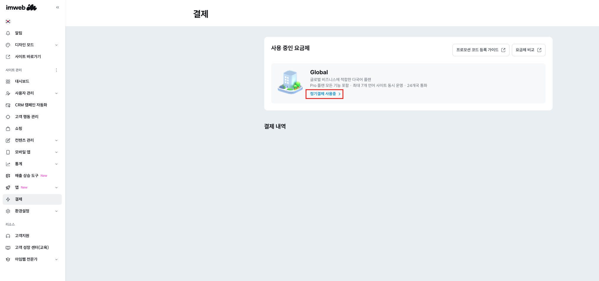 아임웹 이용을 위한 요금제는 정기결제 형태로 제공되고 있어요!