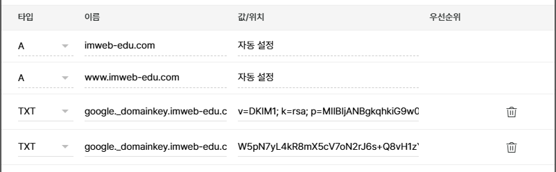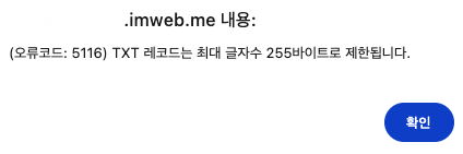 아임웹의 TXT 레코드는 최대 글자수 255바이트로 제한됩니다. 구글 워크스페이스 이메일 인증을 위해 255바이트 이상의 레코드 값을 입력하실 경우 "TXT 레코드는 최대 글자수 255바이트로 제한됩니다" 문구가 보이며 레코드 추가가 불가해요.