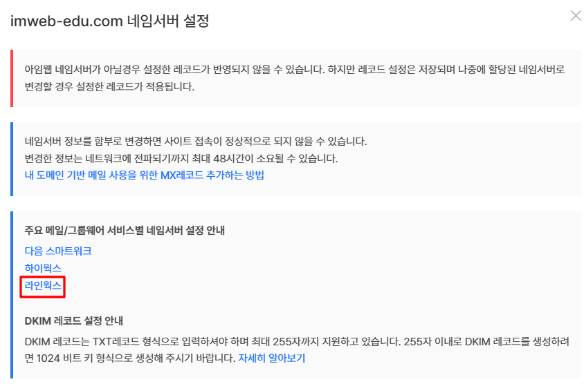 ⓘ 예시 사용하는 메일 주소가 123@imweb-edu.com이라면, imweb-edu.com 도메인의 네임서버 설정 버튼 클릭