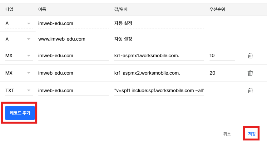 ⓘ 예시 웹 메일 도메인이 imweb-edu.com이라면, 아래와 같이 입력됩니다.