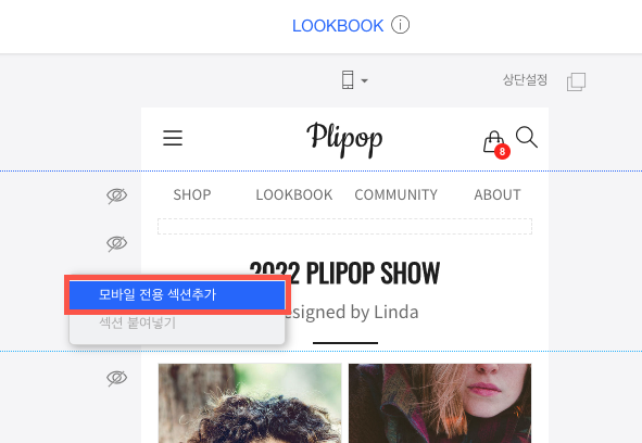 컨텍스트 메뉴가 나오면 모바일 전용 섹션추가를 클릭합니다.