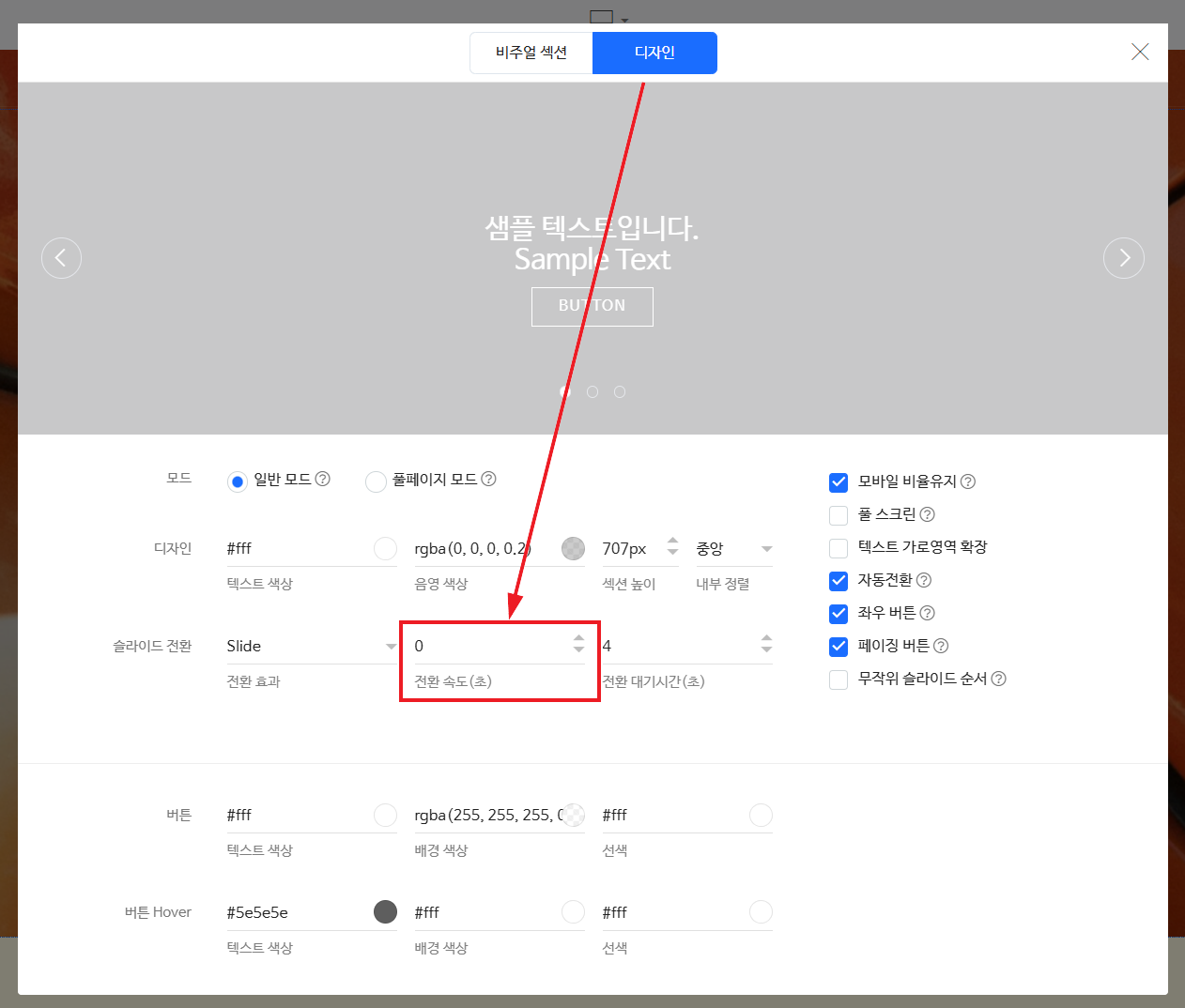비주얼 섹션의 이미지가 전환(슬라이드)되는 과정에서 간헐적으로 하얀 배경이 노출된다면, ‘전환 속도’ 설정을 확인해 주세요.