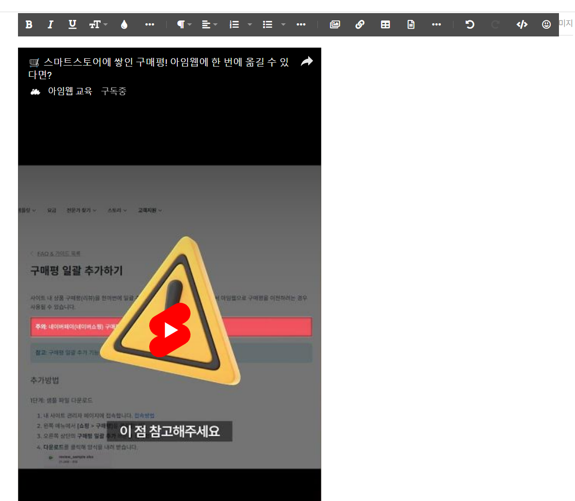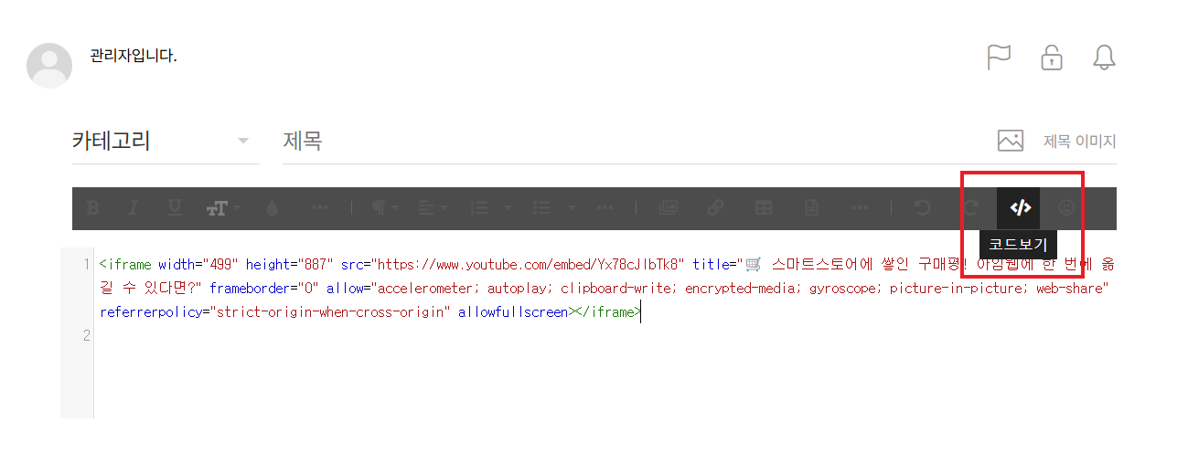 - 게시글 시스템바에서 </> 코드보기버튼을 클릭한 뒤, 복사한 소스코드를 붙여 넣어 주세요.