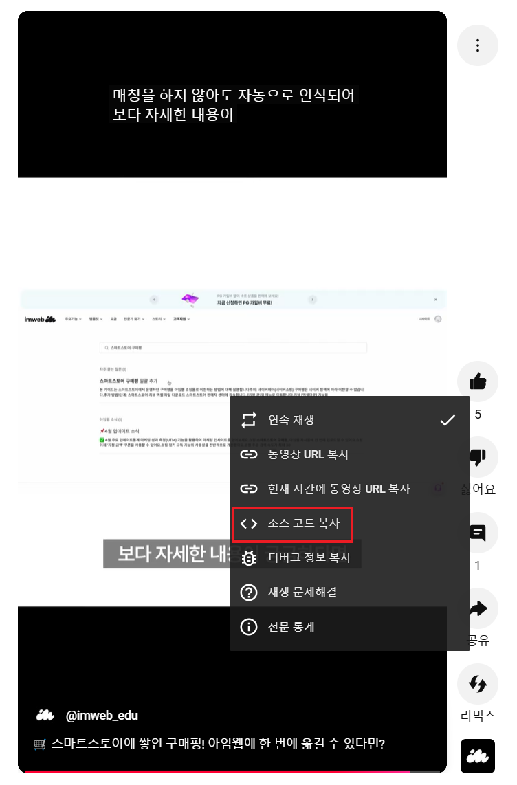 - 유튜브 쇼츠 영상에서 마우스 우클릭 후 소스코드 복사를 선택해 주세요.