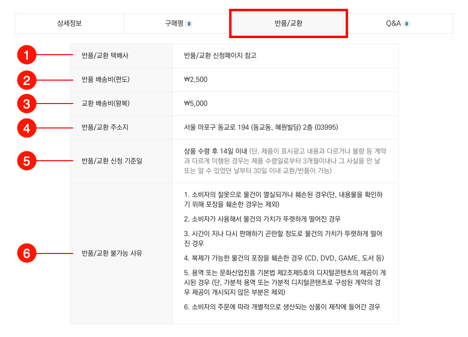 상품 상세페이지의 반품/교환 탭에 표시되는 6가지 반품/교환 정보를 내 쇼핑몰에 맞게 수정할 수 있습니다.