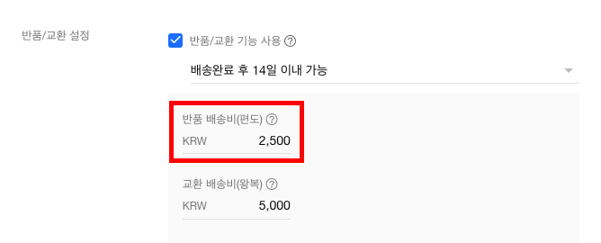 반품/교환 설정 항목에서 반품 배송비(편도) 금액을 입력합니다.