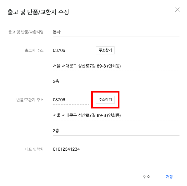 반품/교환지 주소 항목에서 주소찾기 버튼을 클릭해 주소를 설정합니다.