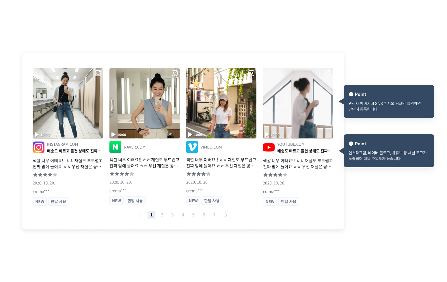 관리자 페이지에 SNS 게시물 링크만 입력하면 간단히 등록할 수 있어요.