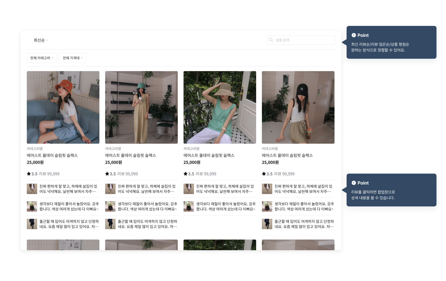 7. 상품 목록 위젯 : 상품 사진의 섬네일을 중심으로, 상품별 리뷰를 보여주는 위젯입니다.
