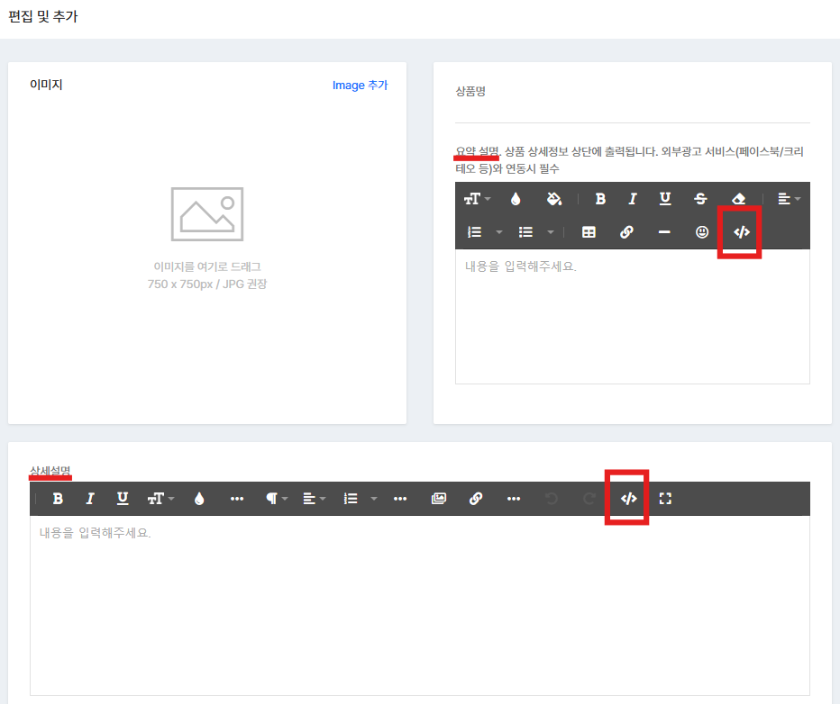 [ 관리자 페이지 > 쇼핑 > 상품 > 상품명 클릭(편집및추가)] 후 '요약 설명' 혹은 '상세 설명' 항목에 추가