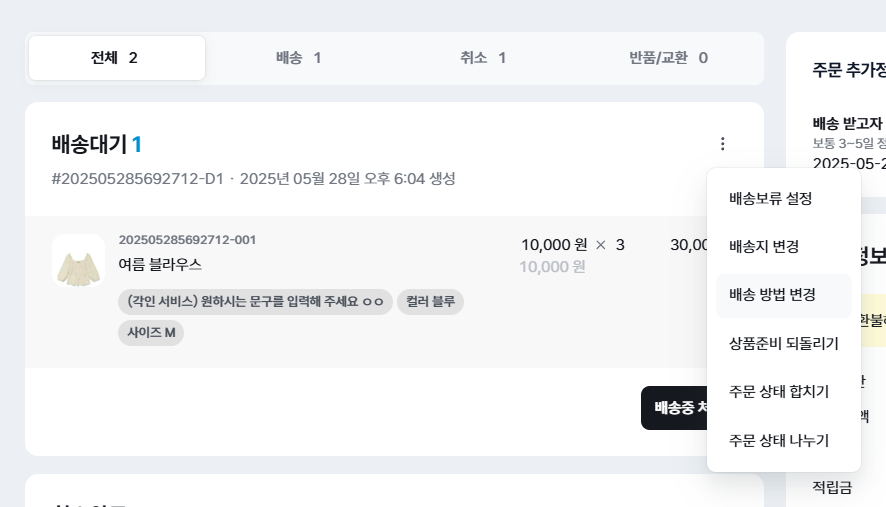 - 주문 상세페이지에서 상단의 더보기(...) 버튼을 클릭 후 배송 방법 변경을 선택합니다.