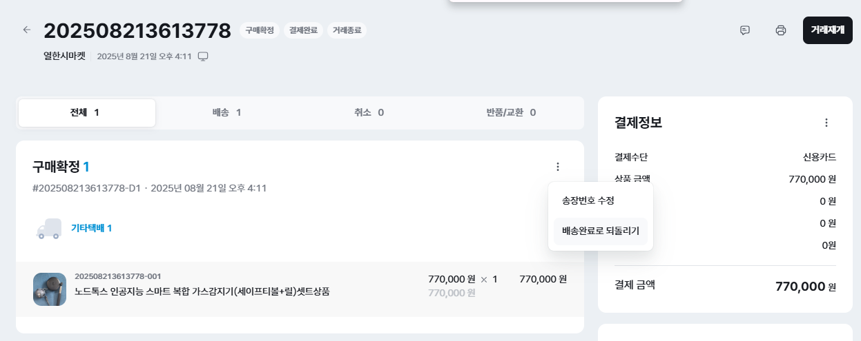 - 구매 확정 상태 → [주문 상세페이지 상단 거래재개 버튼 클릭 > 주문 상세페이지 상단 더보기(...) 버튼 클릭 > 되돌리기 항목 선택]
