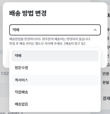 - 표시되는 모달에서 변경할 배송 방법을 선택 후 저장 버튼을 클릭합니다.