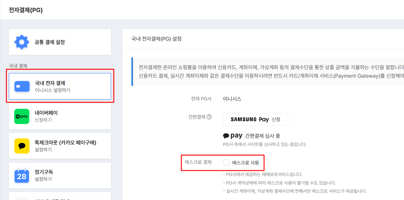 왼쪽 탭에서 국내 전자 결제를 클릭하고, 에스크로 결제 항목에서 에스크로 사용 옵션을 선택합니다.