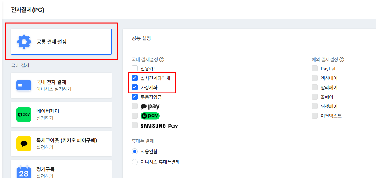 공통 결제 설정 탭에서 국내 결제설정 옵션에 실시간계좌이체 및 가상계좌가 선택되어 있는지 확인합니다. (에스크로 결제창은 해당 결제수단에서만 작동합니다.)