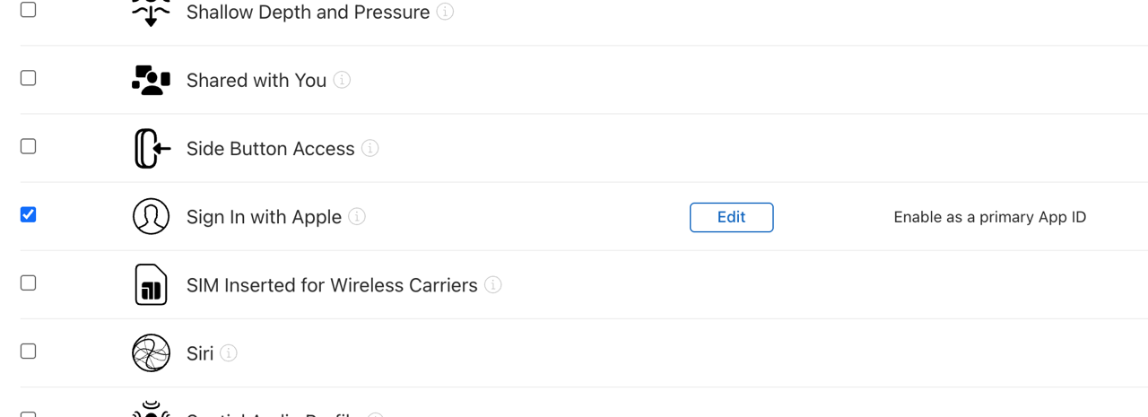 - Capabilities → Sign In with Apple → Edit