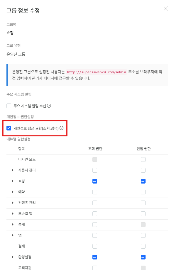 개인정보 접근 권한(조회,검색) 옵션을 클릭합니다.