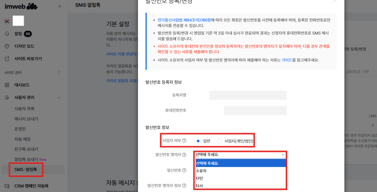발신 번호를 등록하기 위해 사이트 소유자의 사업자 여부와 발신 번호 명의자 유형을 선택해요.