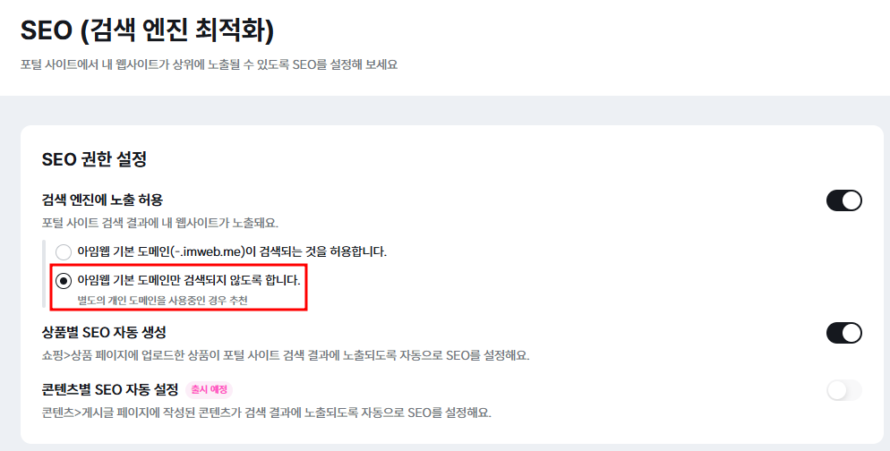 검색엔진이 아임웹 기본 도메인을 수집하지 못하도록 차단합니다.