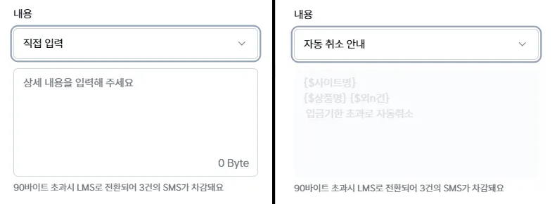 SMS 로 발송 시에는 메세지 내용은 직접 입력하시거나, 템플릿을 선택하실 수 있습니다. (알림톡은 템플릿만 사용 가능)