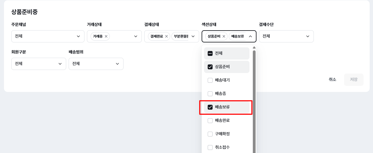 배송 보류 주문 또한 상품준비중 및 배송대기 탭에서 확인되길 원하신다면 아래 방법으로 탭 설정을 변경해 주세요.