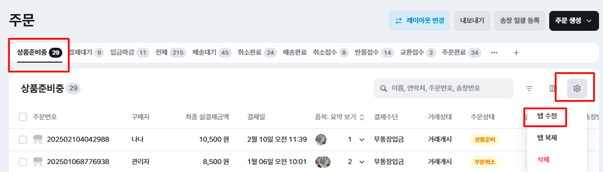 1. [관리자 페이지 > 쇼핑 > 주문관리v2]로 접속하여 '상품준비중' 및 '배송대기' 탭으로 이동 후 [탭 설정 > 탭 수정]을 클릭합니다.