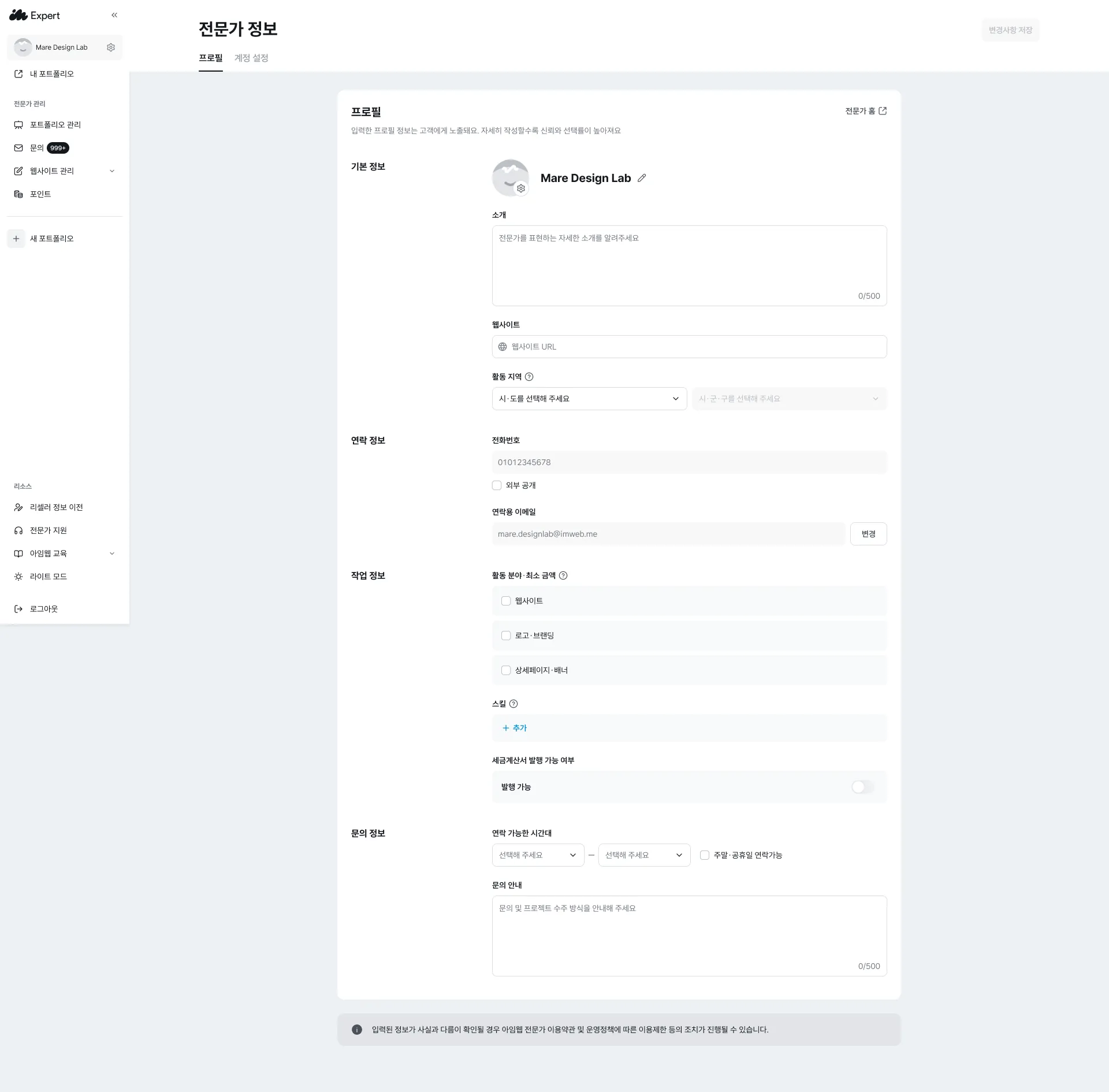 전문가 관리 페이지에서 작성한 내용은 고객들이 확인하는 전문가 프로필 페이지에 반영돼요.
