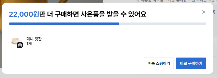 4. 이제 사은품이 적용된 상품을 구매하면 사은품이 자동 증정될 예정이에요. 사은품 조건이 미달인 경우 아래와 같이 안내 팝업이 노출됩니다.